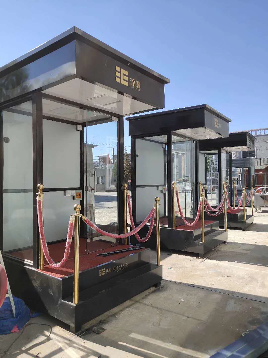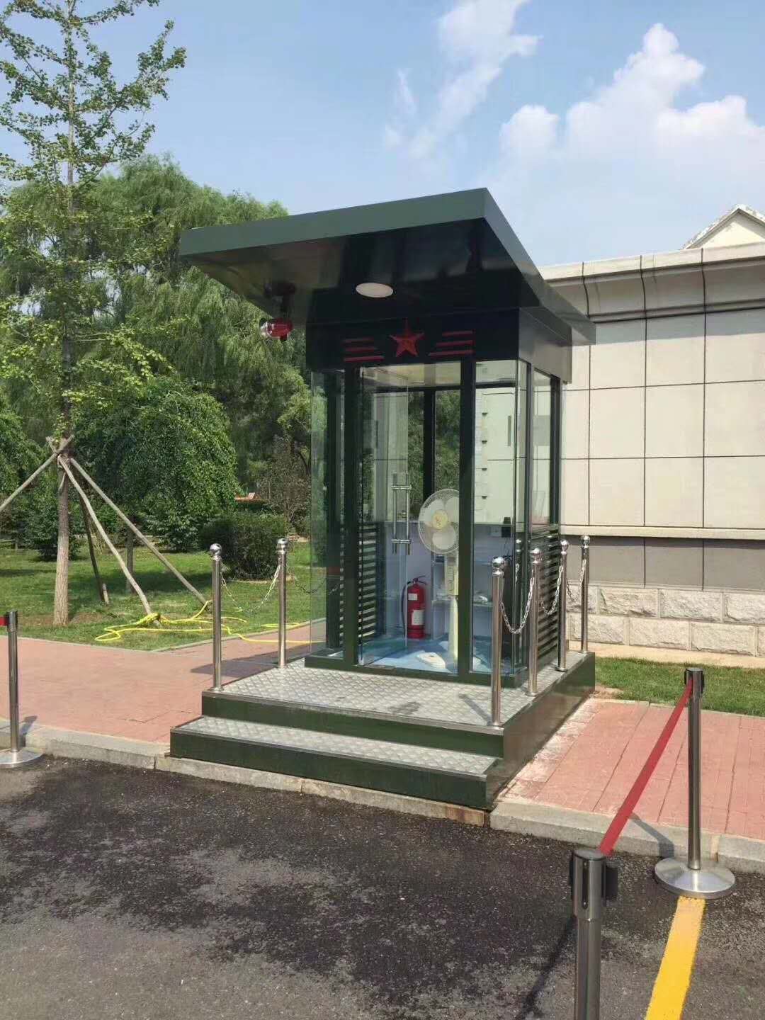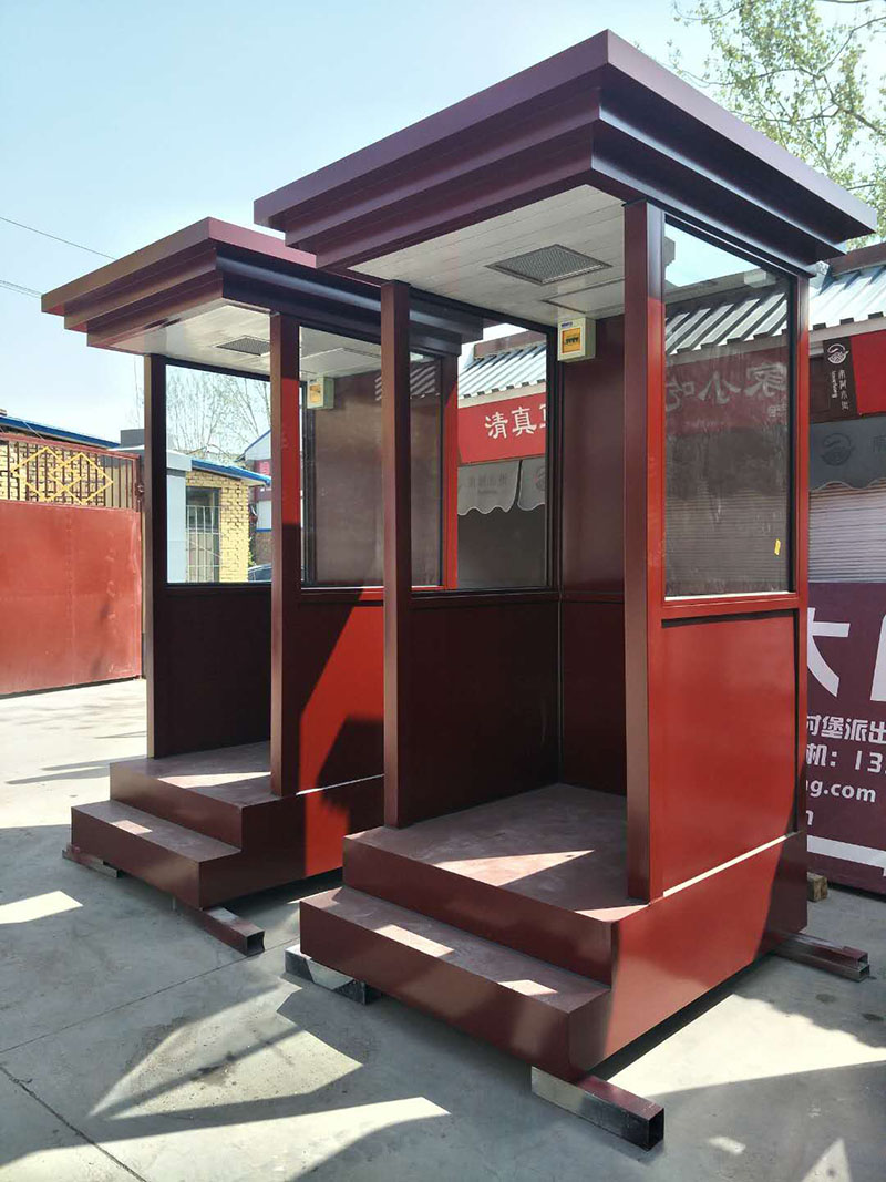 值班崗?fù)さ闹饕埞菫殇摻Y(jié)構(gòu)龍骨,起尺寸為40x60x1.5mm鍍鋅龍骨;立柱一般為堅固耐用的型鋼,尺寸規(guī)格有80x80x2.0mm,40x80x2.0mm等等,可根據(jù)產(chǎn)品的大小不同而來決定立柱的大小;玻璃一般為8mm鋼化玻璃,具有較強的抗沖擊力,即使破碎也不會傷到人;地板為3mm防滑鋼板,鋪紅色地毯,四周可用鈦金立柱和紅絨繩作為裝飾件,使產(chǎn)品看起來更美觀,大氣,高檔。